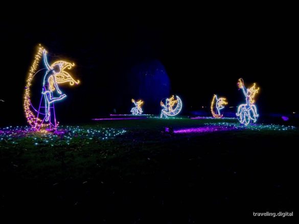 Nach einem Besuch bei den zarten Figuren im Feenreich, führt der Weg zu den Schönheiten der Savanne. Mit Giraffe, Zebra und X wurden auch die Zootiere des Stadtgartens liebevoll in die Lichtinstallationen integriert. Mit Sterntaler, Himmelsgrüßen und dem Tanz der Sterne geht es danach himmlisch weiter. Für viele Besucher wird jedoch das Glockenspiel der absolute Höhepunkt sein: Der neun Meter lange Durchgang aus schimmernden Lichtkugeln ist nicht nur ein grandioses Fotomotiv: Er wirkt wie eine warme Umarmung aus Klängen, Licht und Farben.