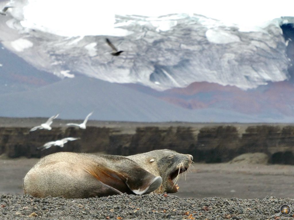 Die schönen Tiere sind auch unter dem Namen Pelzrobbe bekannt und wurden in den dunklen Jahren von Deception Island fast ausgerottet. Doch zum Glück sind sie zurückgekehrt, haben sich erfolgreich vermehrt und Ihren Lebensraum inzwischen zurückerobert. Sie scheinen zu wissen, dass sie nichts mehr von Menschen zu fürchten haben und bleiben trotz unserer Anwesenheit vollkommen gelassen. Auch wir entspannen und genießen die schöne Aussicht und die Gesellschaft der drolligen Seebären.